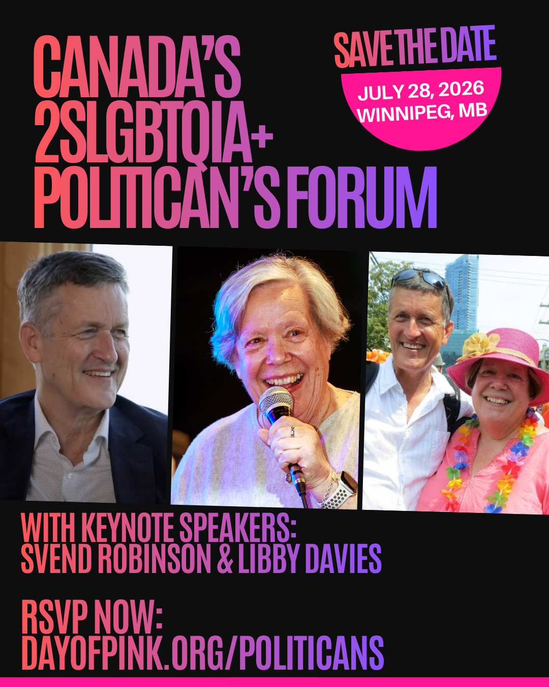 We are deeply honored to welcome two trailblazers who paved the way for 2SLGBTQIA+ representation in Canadian history: Svend Robinson & Libby Davies