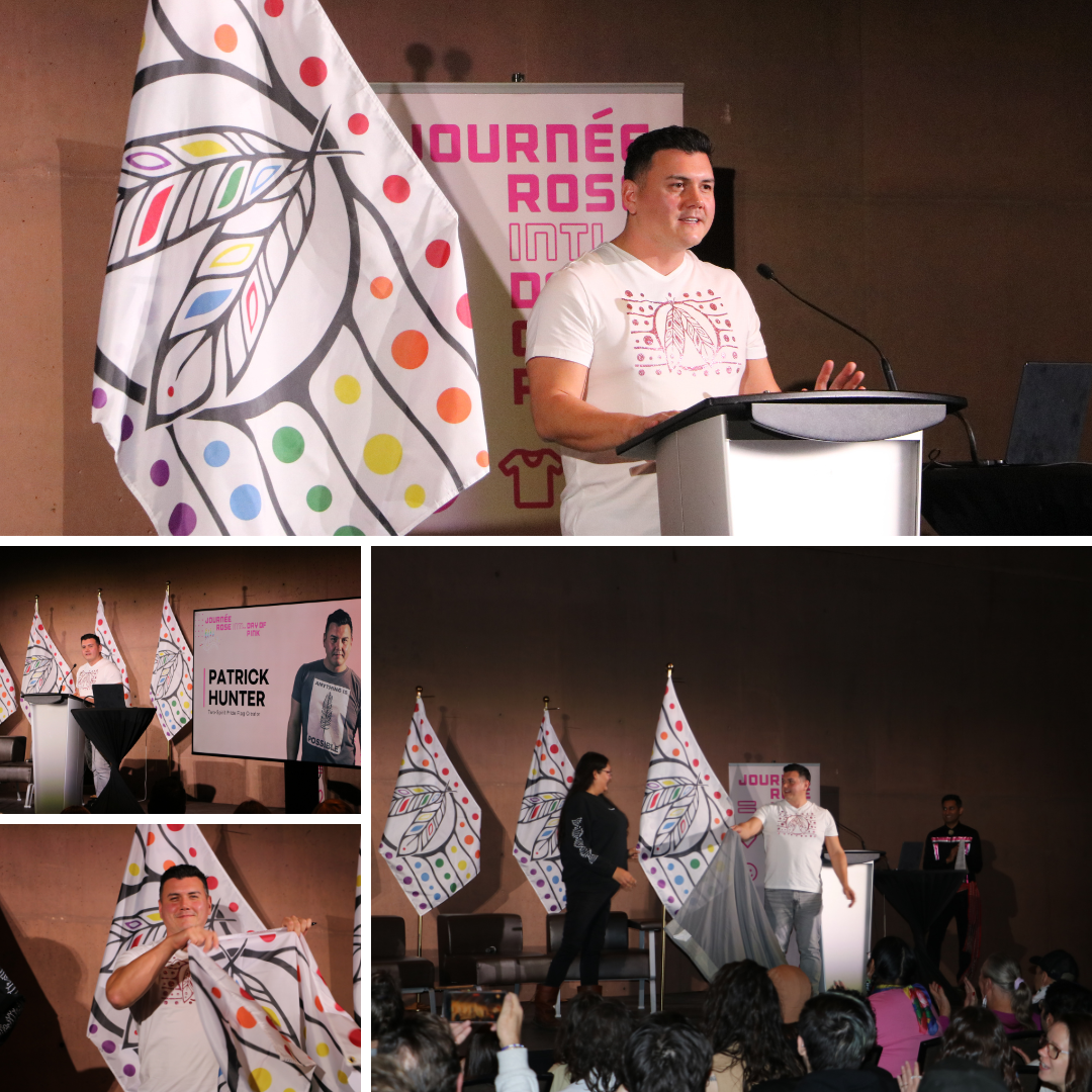 The design features two stylized eagle feathers, symbolizing the harmony of masculine and feminine energies that dwell within us all. As Patrick notes, “We walk Turtle Island with these two perspectives at all times, and if they are in harmony, we can achieve anything.” These feathers rest on giizis, the sun, which illuminates our world, representing the boundless nature of our spirits. Patrick beautifully expresses this idea: “Science tells us that we’re all made from star stuff, as old as the universe.” Circles within the design reflect the spectrum of visible light and celebrate the ancient artistic traditions of Indigenous peoples, adding movement and magic to the flag.